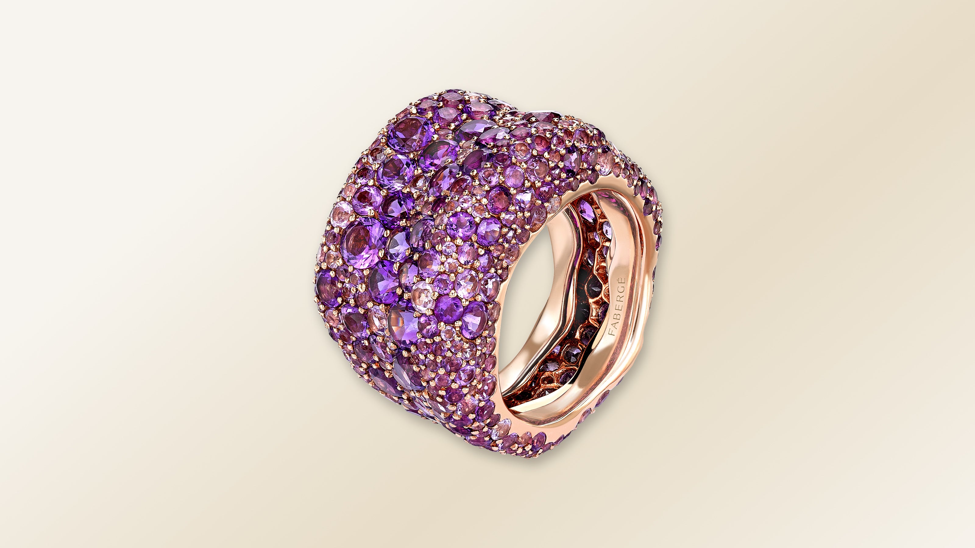 تم تثبيت 433 من الجمشتات المستديرة على Emotion خاتم كبير من الذهب الوردي والجمشت. تستكشف مجموعة Emotion، المليئة بالألوان الزاهية، الغنى الفكري والفني لعالمنا. هذه المجوهرات الجريئة والمغامرة، تدفع حدود التصميم والحرفية بروح Fabergé الحقيقية.