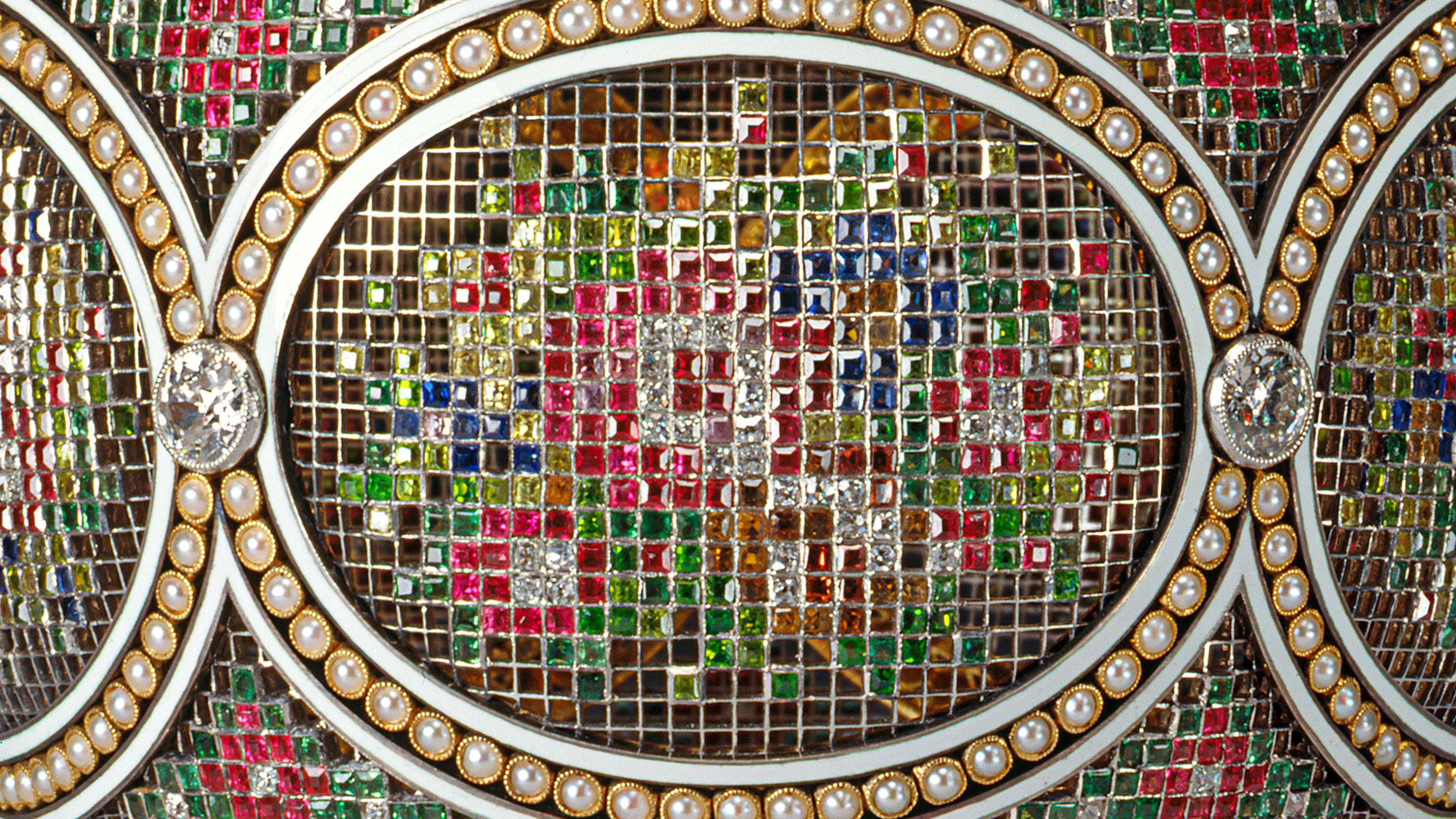 The egg was the Emperor’s Easter gift to his wife, Empress Alexandra, in 1914, but the original invoice was destroyed and the cost is therefore unknown. The Empress’s monogram and the date 1914 are set beneath a moonstone at the apex of the egg. It comprises a platinum mesh into which tiny diamonds, rubies, topaz, sapphires, demantoid garnets, pearls and emeralds are fitted – perfectly cut, polished and calibrated to fill the spaces. This extraordinary technical feat is all the more impressive because the platinum is not welded but cut. The five oval panels around the centre of the egg feature a stylised floral motif, replicating the technique of petit-point.