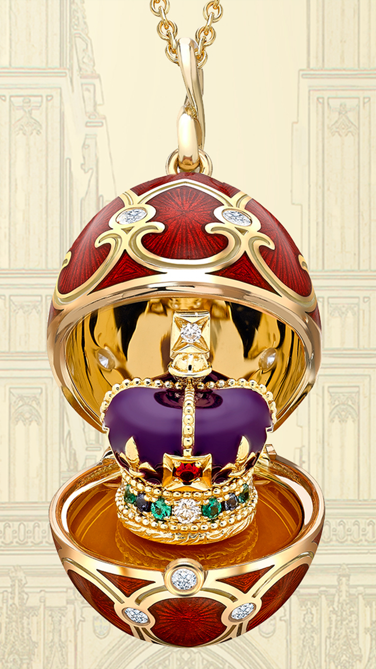 قلادة مفاجأة تاج التتويج التراثية مستوحاة من تاج القديس إدوارد، التاج المستخدم في لحظة التتويج وأحد أغلى كنوز الأمة. تم صنع قلادة مفاجأة تاج Fabergé من الذهب الأصفر عيار 18 قيراطًا، ومزخرفة يدويًا بطلاء أرجواني مهيب ومرصعة بأربع ياقوتات زرقاء مستديرة و10 زمردات زامبية مستديرة Gemfields و2 ياقوتة موزمبيقية مستديرة Gemfields ، وتجلس على منصة من حجر العقيق المنحوت.