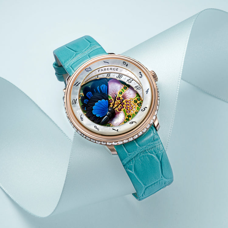 في هذه الحركة اليدوية، تتحرك أجنحة الفراشة بشكل مستقل، بسرعات مختلفة، كل منها ينطلق للإشارة إلى الدقائق. تحول هذه الدورة التي تتم كل ساعة مرور الوقت إلى مشاهد من الجمال الزائل، مما يعكس الروح المبتكرة والخيالية لبيتر كارل Fabergé ، الذي تصور إبداعاته لتكون عاطفية وآسرة في نفس الوقت.