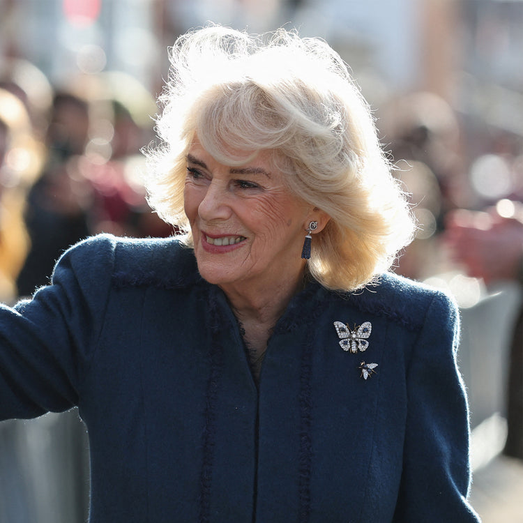صاحبة الجلالة الملكة تلتقي بالمعجبين خلال زيارة إلى ميدلزبره يوم الخميس 13th فبراير، بينما كانت ترتدي أقراط تاسل إمبراطورية من الذهب الأبيض والياقوت الأزرق. كانت الملكة مصحوبة بالملك تشارلز الثالث.