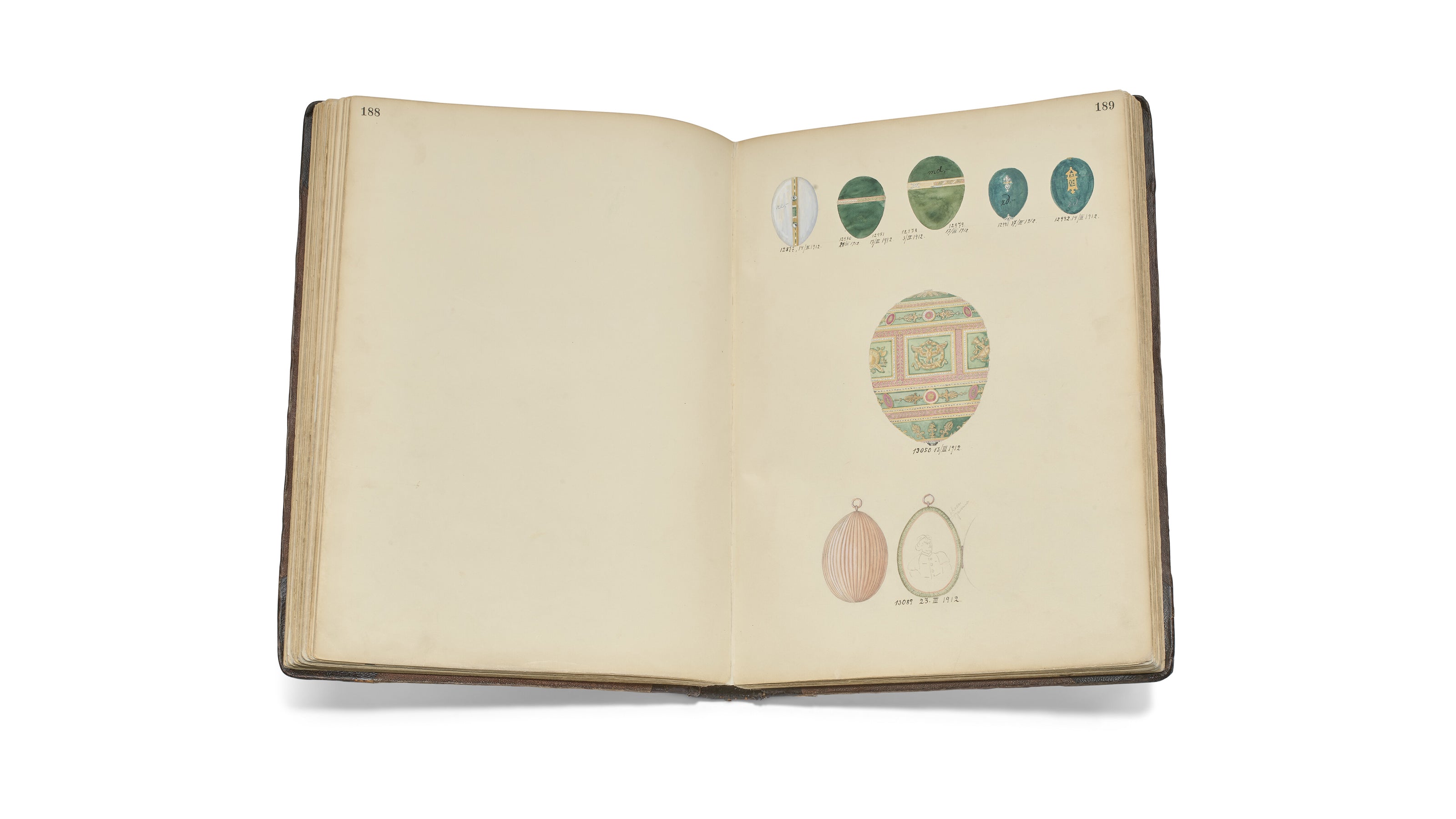 Featuring more than a thousand beautifully detailed drawings, this remarkable album offers a rare glimpse into the world of Fabergé between 1911 and 1916. Its pages reveal an array of exquisite creations – from clocks and bonbonnières to elegant picture frames, parasol handles, bell-pushes, and countless other luxurious treasures. Among the highlights is the famed 1912 Imperial Napoleonic Easter Egg, one of Fabergé's most iconic masterpieces