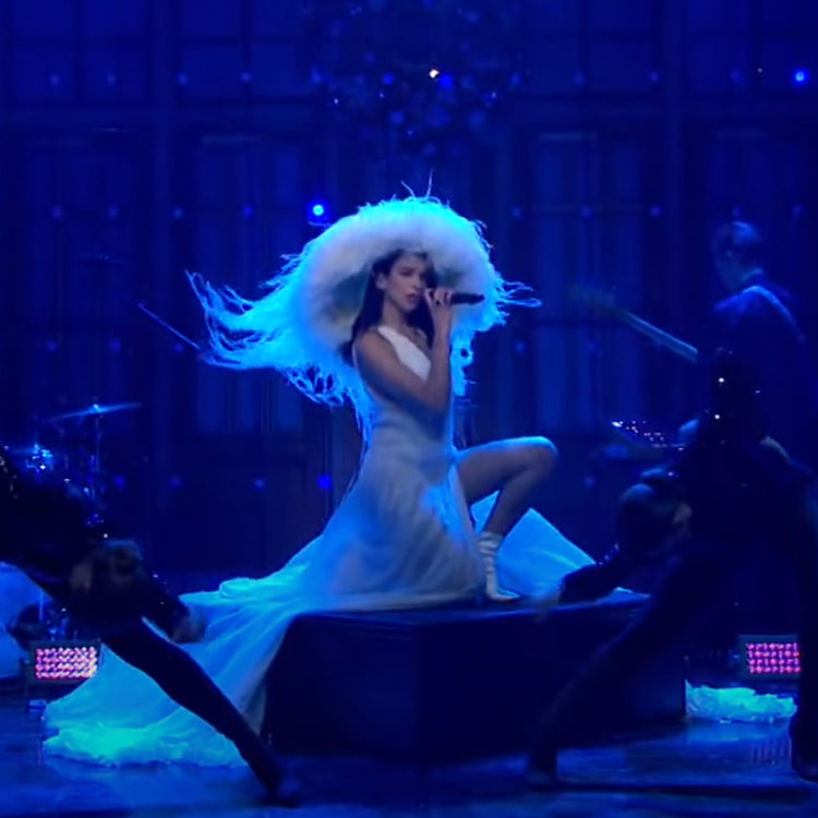 La cantante británica Dua Lipa lució el collar y anillo transformables de esmeraldas y diamantes de James Ganh x Fabergé en Saturday Night Live este fin de semana, donde también interpretó su exitoso sencillo "Levitating".