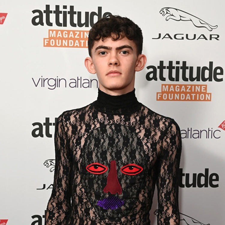 El actor y estrella de 'Heartstopper' de Netflix, Joe Locke, luce una pila de anillos estriados con piedras preciosas multicolores del arcoíris en oro blanco bañados en rodio negro Colours of Love para asistir a los Virgin Atlantic Attitude Awards 2021 en The Roundhouse en Londres.