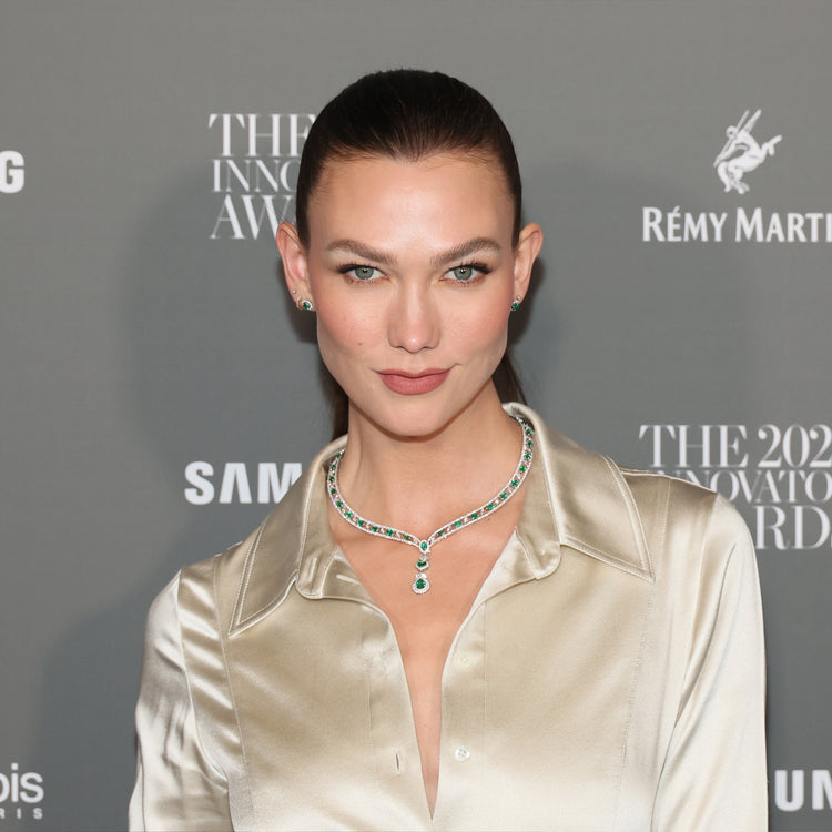 Karlie lució los pendientes de esmeralda y diamantes Fabergé y el collar de esmeralda y diamantes Fabergé x James Ganh con Gemfields.