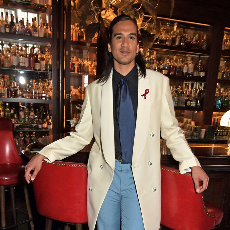 El actor británico, Nathaniel Curtis, asistió a la fiesta de los Oscar 2022 de la Fundación Elton John contra el SIDA el 27 de marzo de 2022. Nathaniel lució un pendiente de gota de huevo engastado con diamantes y oro blanco cepillado Treillage Fabergé , un anillo estriado con piedras preciosas multicolores del arco iris de oro blanco chapado en rodio negro de 5 mm de ancho Colours of Love , un anillo estriado con piedras preciosas multicolores del arco iris de oro blanco Colours of Love con zafiros ocultos y un anillo de eternidad estriado con piedras preciosas multicolores del arco iris de oro blanco Colours of Love .