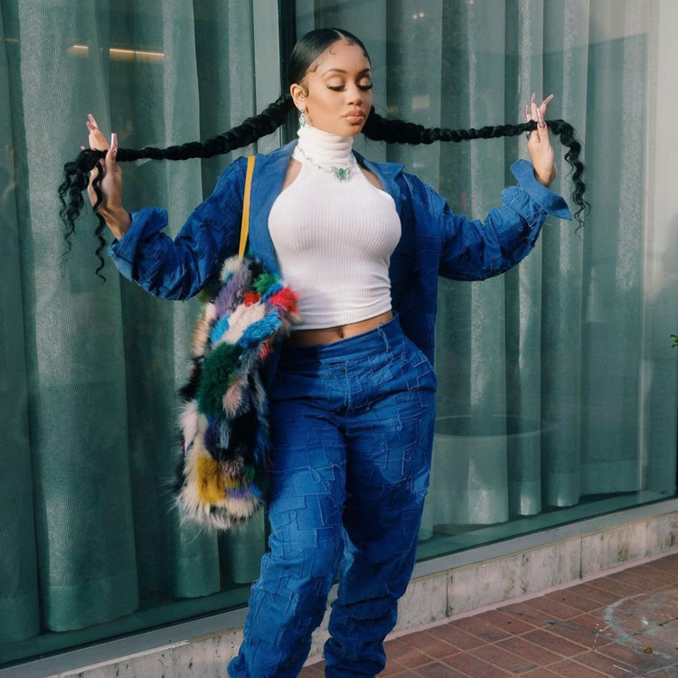 La rapera y compositora estadounidense, Saweetie, luce aretes tipo candelabro de diamantes y esmeraldas en oro blanco de Colours Colours of Love Love; broche/collar transformable de mariposa con tsavorita y esmeraldas en oro blanco Fabergé x James Ganh; anillo de esmeralda de corte octogonal en platino y oro rosa Colours of Love con diamantes ; anillo de esmeralda de corte escalonado 5.12 Colours of Love engastado con diamantes y anillo de diamantes y esmeralda de corte cojín en oro blanco Fabergé x James Ganh mientras está en Los Ángeles y filma para la revista InStyle.