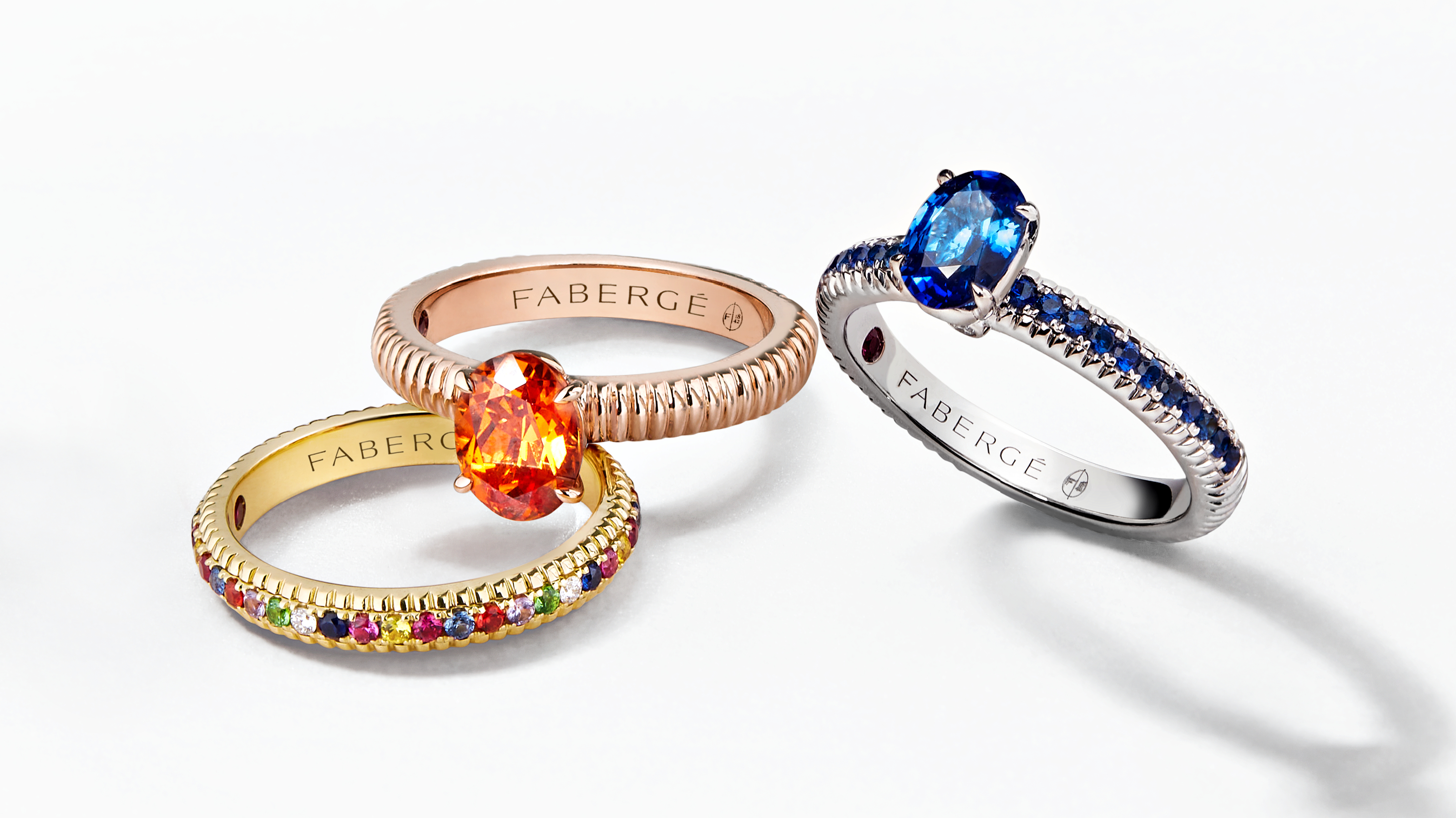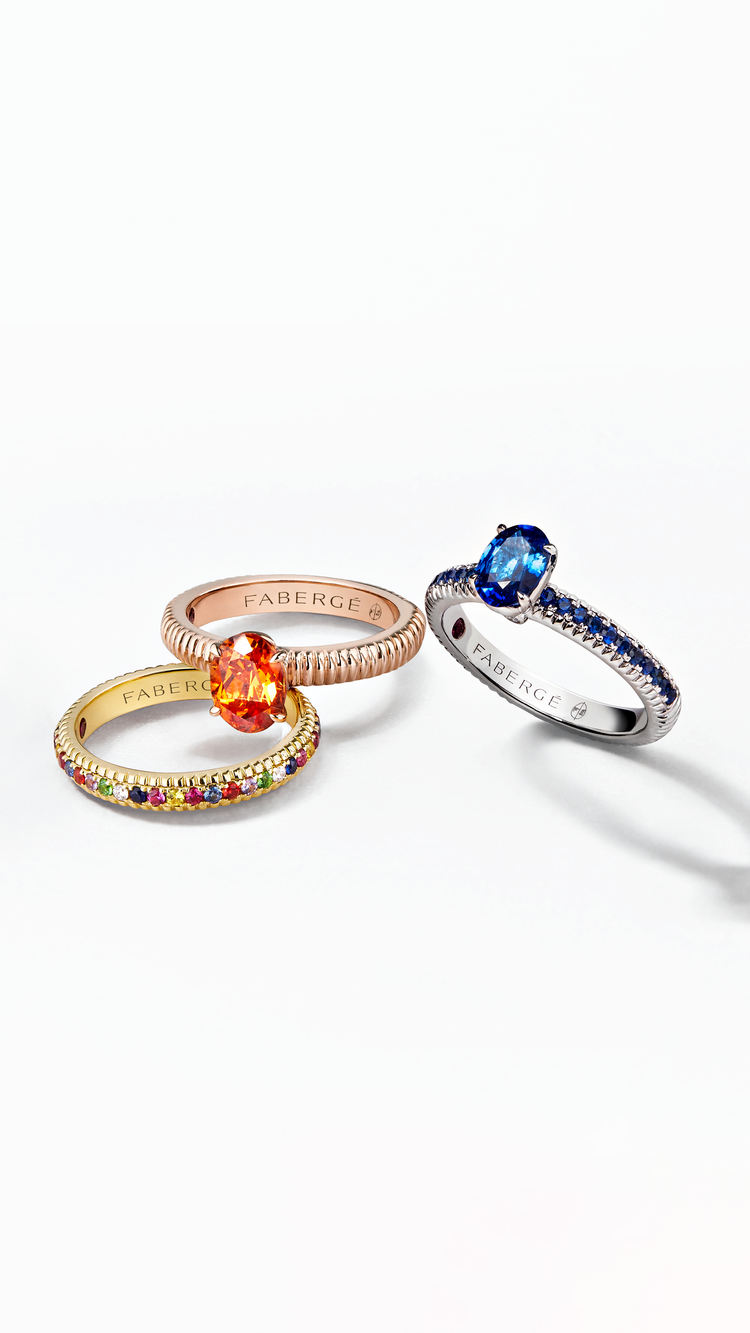 Los anillos de compromiso Fabergé están predominantemente engastados con piedras preciosas de colores, con opciones de piedras preciosas de corte redondo, ovalado, pera, marquesa y esmeralda.
