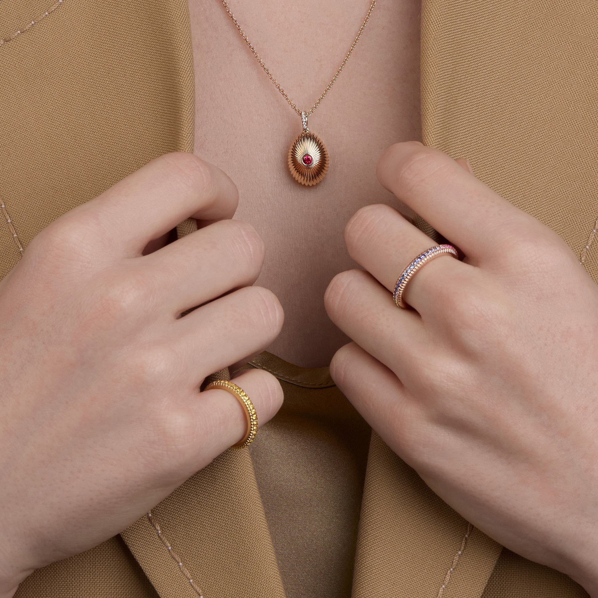 When applied to fine jewellery, fluted designs are brought to life through the duality of the motif, creating a captivating play of light and revealing the versatility and beauty of 18k gold jewellery.