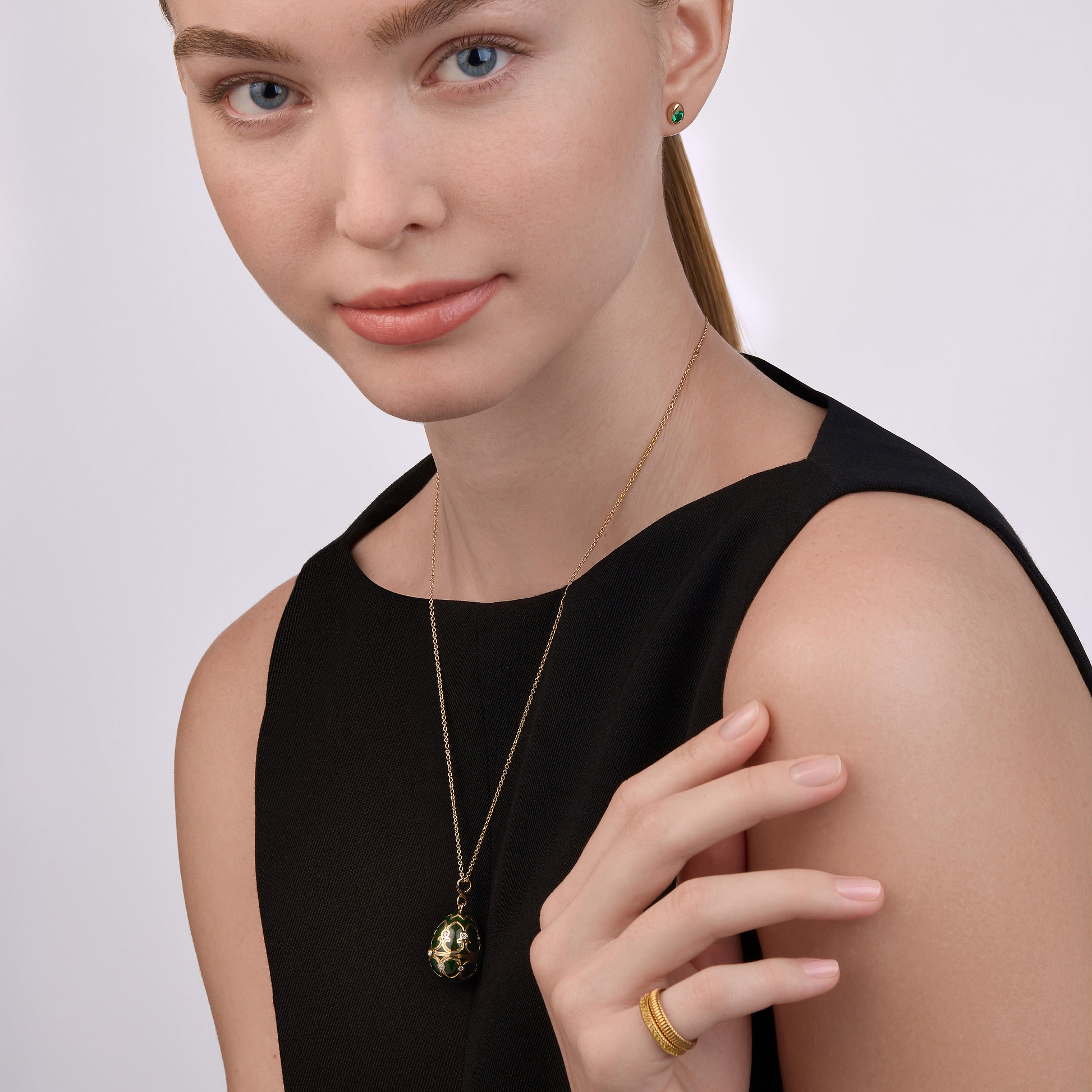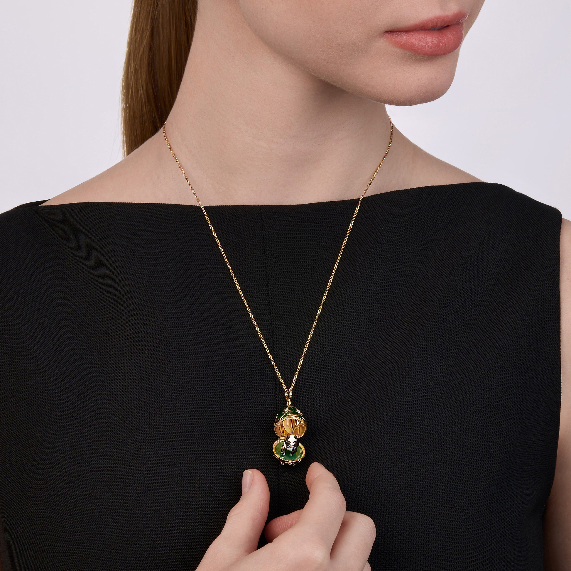 Esta encantadora sorpresa de panda está elaborada en oro amarillo de 18k recubierto de laca blanca y negra y presenta brillantes ojos de diamantes negros y pequeñas huellas doradas. Sentado sobre una base de piedra de crisoprasa verde y sosteniendo un trozo de bambú dorado, este oso especial está encerrado en un relicario en forma de huevo de oro amarillo de 18k de 22 mm, pintado a mano con esmalte verde oscuro y adornado con diamantes blancos, suspendido en un colgante de 50 cm de 18k. cadena de oro amarillo.