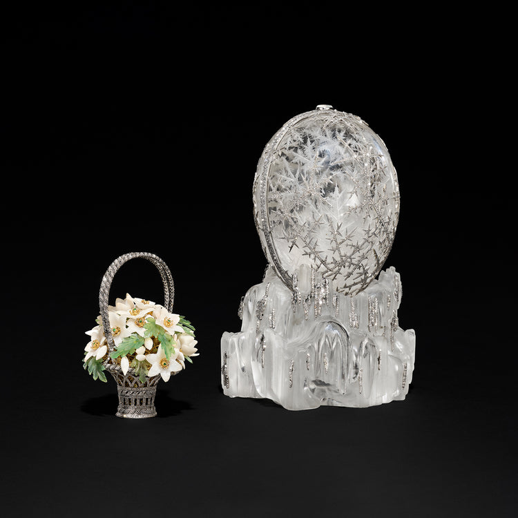 The Winter Egg encapsulates the essence of winter in a frozen wonderland, through the interplay between carved rock crystal and white diamonds. The egg is crafted from rock crystal as thin as glass, embellished with engraving along with platinum and diamonds to resemble frosts. The egg rests on a rock crystal base designed, and carved, to resemble block of melting ice. As with all Fabergé eggs, the creation opens to reveal a surprise nestled inside – on this occasion, a delicate bouquet of wood anemones which appear to burst through the frosts. The flowers are made from white quartz, nephrite, demantoid garnets and gold, and they emerge from moss made of green gold. The overall height is 14.2cm, and the creation is set with a total of 3,246 diamonds.