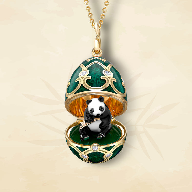 Этот восхитительный сюрприз в виде панды изготовлен из 18-каратного желтого золота, покрыт черным и белым лаком, имеет сверкающие черные ромбовидные глаза и маленькие золотые отпечатки лап. Этот особенный медведь сидит на подставке из зеленого камня хризопраз и держит кусок золотого бамбука. Он заключен в медальон яйцеобразной формы из желтого золота 18 карат, расписанный вручную темно-зеленой эмалью и украшенный белыми бриллиантами, подвешенный на желтом золоте 18 карат. цепь.