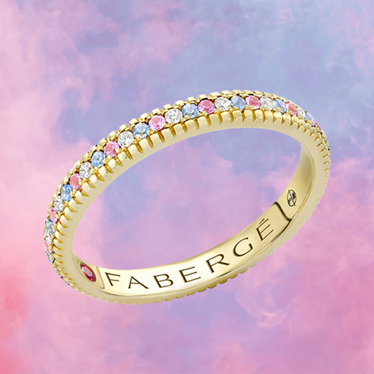Кольцо Fabergé Colours of Love из желтого золота с бриллиантами и сапфирами Trans Flag Fluted Eternity можно приобрести на сайте Faberge.com, в наших бутиках в Хьюстоне и Лондоне, а также через нашу услугу «По предварительной записи». По вопросам продаж обращайтесь по адресу sales@faberge.com .
