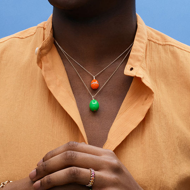 Яйца из 18-каратного розового золота покрыты лаком ярких оттенков розового, зеленого лайма, оранжевого, желтого и синего. Лак — идеальный материал для придания сногсшибательного флуоресцентного оттенка — без ограничений на оттенки цвета, которые можно применять, наша творческая команда потратила много месяцев на разработку идеальных неоновых оттенков для коллекции, совершенствуя цветовые палитры, пока не было создано идеальное сочетание. достигнуто. Клиенты также могут проявить творческий подход, воспользовавшись нашей индивидуальной услугой, изменив свой собственный кулон-яйцо в цвет по своему выбору.