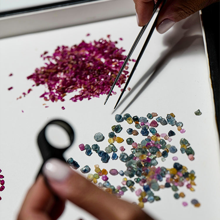 这件作品中使用的特殊红宝石是根据其形状和切工而特别挑选的,可以在贝壳内部看到一系列梨形和榄尖形切工红宝石,镶嵌在城堡风格中,逐渐演变成粉红色蓝宝石和然后变成白色钻石。重头戏是梨形 4.06 克拉莫桑比克红宝石,负责任地从 Gemfields 采购,镶嵌在 18k 玫瑰金中,傲然地坐落在黑色镀铑 18k 白金表冠内,这是核心惊喜。这顶王冠的概念是由米歇尔·克莱普顿 (Michele Clapton) 构思的,她说如果丹妮莉丝登上了铁王座,她就会为她制作这顶王冠的微型版本。每颗珍贵的红宝石都经过特别精密的切割和抛光,以增强其自然光泽,并且颜色和质量的一致性在每个阶段都经过严格的质量控制。